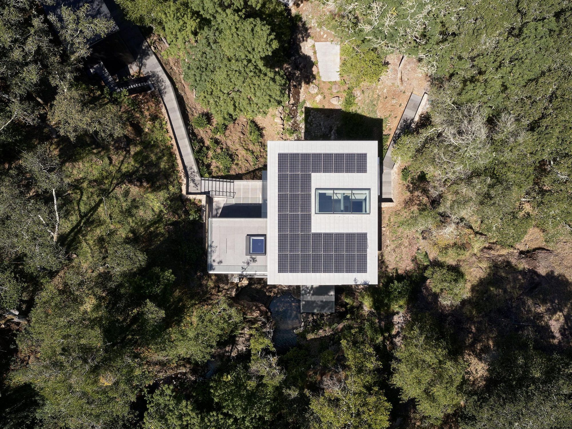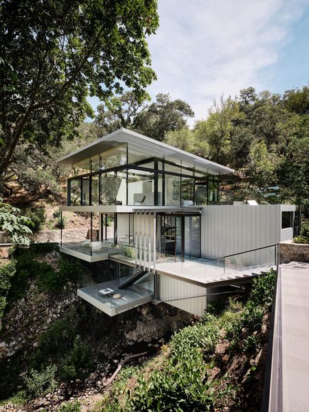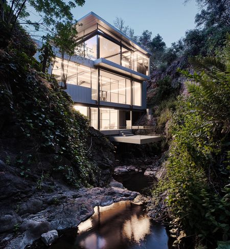 Über einem Bachlauf, der von einem Wasserfall in den Wäldern Nordkaliforniens gespeist wird, schwebt ein dreistöckiges, mit Zink verkleidetes gläsernes Schmuckkästchen. Das vom Architekturbüro Fougeron Architecture entworfene Einfamilienhaus, bekannt als Suspension House, scheint der Schwerkraft und der Zeit zu trotzen. Im Zuge des aufwändigen Renovierungsprojekts wurde ein bestehendes Haus modernisiert und erweitert, wobei die Konstruktion mit Bedacht verbessert und harmonisch in die zu neuem Leben erweckte, üppige Landschaft integriert wurde.