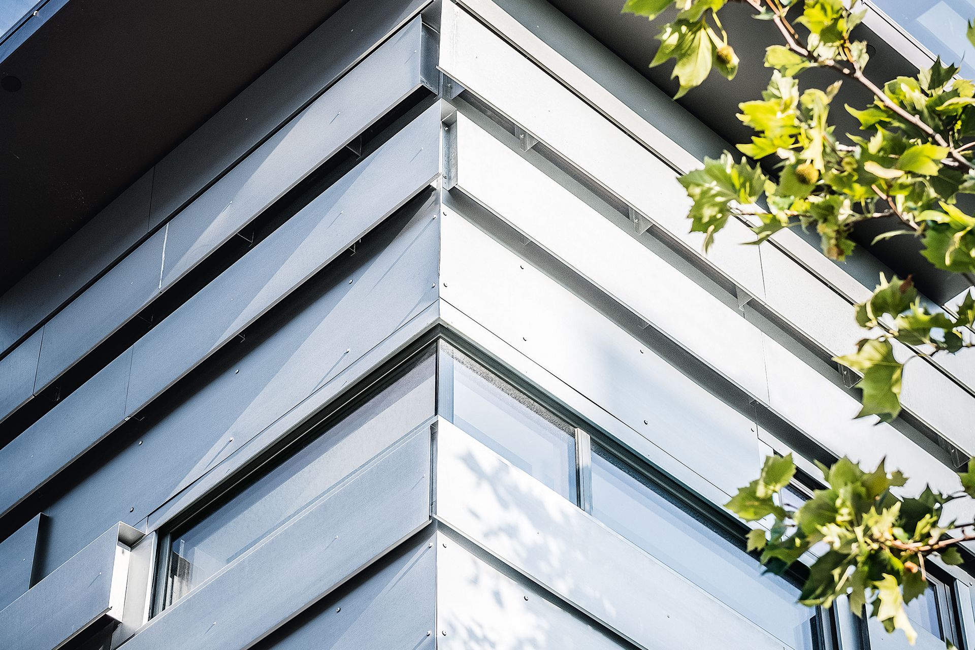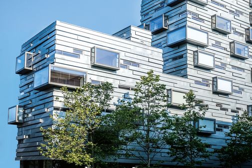 Einen Bezug zur ehemals industriellen Umgebung zu schaffen, das war die Inspiration von Lundgaard & Tranberg Architects bei der Fassadengestaltung des Charlottehaven The Tower im Kopenhagener Stadtteil Østerbro. 16 Stockwerke und 54 Meter hoch ist das Gebäude, das mit rechteckigen, unterschiedlich tiefen und langen Kassetten aus walzblanken Titanzink, die in der Tiefe und in der Länge variieren, bekleidet ist. Insgesamt wurde eine Fläche von rund 3.000 m² mit den dreidimensionalen Kassetten gestaltet und dabei rund 45 t Titanzink verarbeitet. Die lebendige Gestaltung durch die natürliche Bewitterung des Materials unterstreichen das dynamische Erscheinungsbild des Turms.
