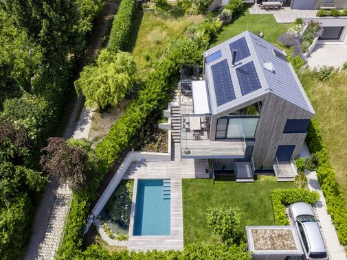 Bei dem Neubau in Wien wurde das klassische Haus mit Satteldach in zeitgemäßer Formensprache interpretiert. Die Lärchenholzfassade und das Titanzinkdach lassen eine scharfkantige, präzise Kubatur entstehen, in die sich auch die besonders flache, die klare Geometrie nicht beeinträchtigende PV-Anlage einfügt.