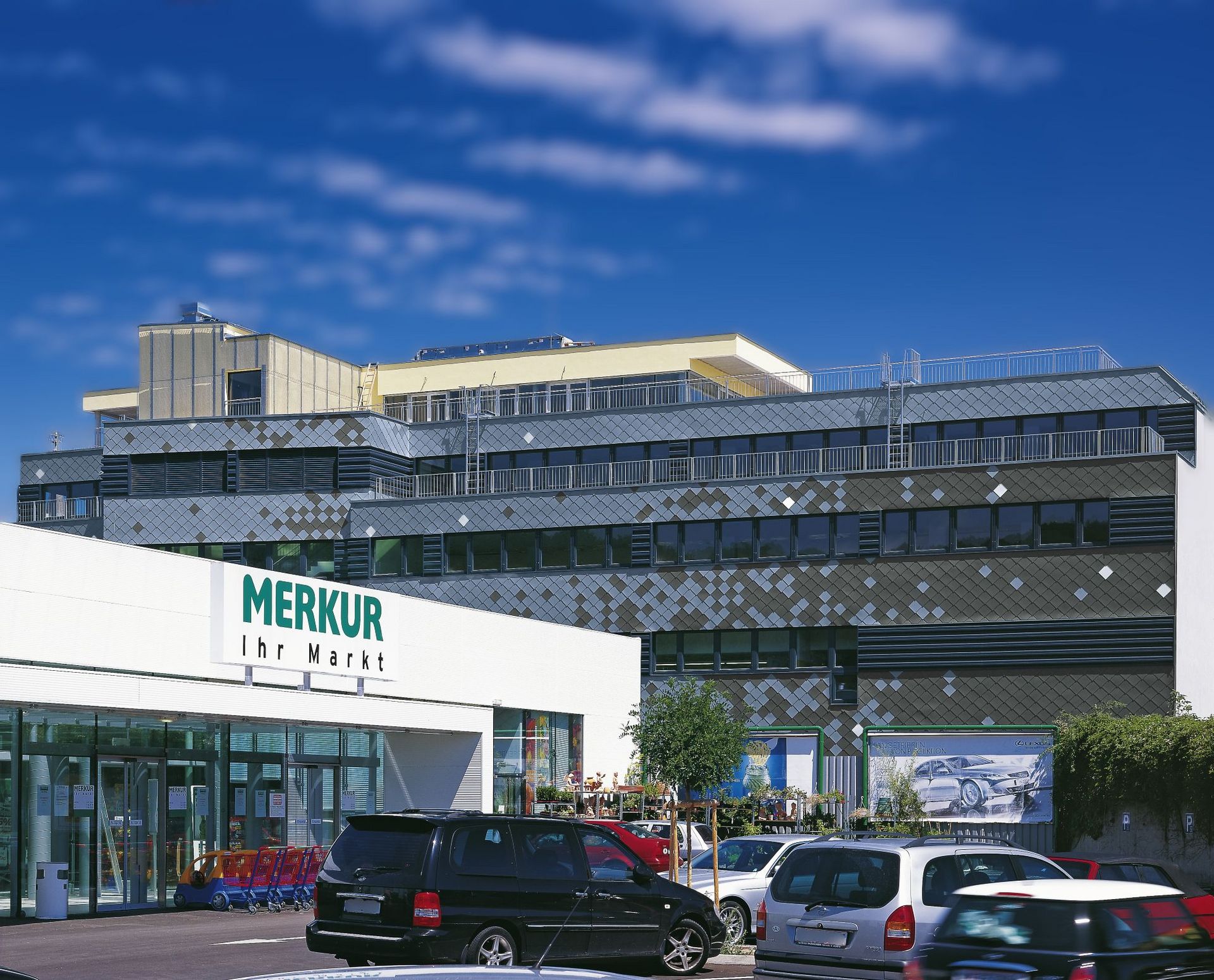 Am Standort Bergmillergasse 5 in Wien entstand ein ungewöhnliches Büro- und Geschäftsgebäude mit mehr als 14.000 m2 Nutzfläche. Das Besondere an diesem Objekt ist die Fassade. Erstmalig hat ein Architekt eine so große Fassade mit kleinen Quadratrauten aus RHEINZINK geschaffen. Bislang wurde diese Rautenform eher für Dächer, Winkel, kleine Flächen und schwierige Formen verwendet. In der großen Fläche eingebunden werden die Rauten zu einem überdimensionalen Mosaikbild mit changierender Oberfläche, das je nach Wetterlage schillernd die Himmelsfarben widerspiegelt. Das Büro- und Geschäftshaus gibt sich mit dieser „Schlangenhautoberfläche“ kühn und extravagant ohne durch allzu große Fremdartigkeit abzuschrecken. Architekt Georg Petrovic hat hierfür die drei unterschiedlichen Rautenoberflächen in einem künstlerischen Entwurf angeordnet. RHEINZINK-Quadratrauten in prePATINA blaugrau und schiefergrau und CLASSIC walzblank bilden in wechselnden Formationen die schimmernd schuppenartige Außenhaut des Gebäudes.