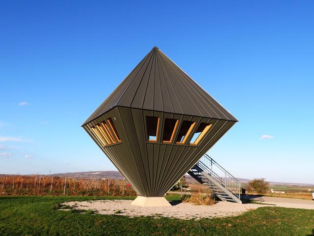 Ein Oktaeder im österreichischen Burgenland ist eines der letzten Kunstprojekte, die der 2019 verstorbene Bildhauer Heinz Bruckschwaiger unter dem Titel „Platonische Körper“ realisierte. Eine der Besonderheiten der beiden vierseitigen und mit 14 Aussichtsfenstern versehenden Pyramiden ist die Bekleidung. Um das Holz dauerhaft zu schützen, wählte der Künstler die Oberfläche RHEINZINK-prePATINA schiefergrau, die sich durch den Patinierungsprozess im Laufe der Jahre verändert. Die Strahlenform der Dachdeckung, wurde durch eine Stehfalzdeckung erreicht. Dadurch waren einerseits die Lagesicherung der Bahnen mit gängigen Haften und andererseits die Übergänge in den Knickbereichen in herkömmlicher Spenglertechnik möglich. Der Oktaeder in der Gemeinde Sigleß ist weithin sichtbar und begeistert seinerseits durch eine Aussicht bis hin zum Neusiedler See.