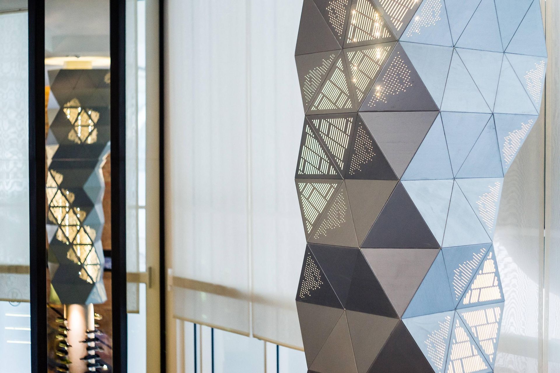 Die mit dem Michelin-Stern geadelte Küche des Restaurants „Senses“, wurde 2017 auch in das internationale Gastronomie-Ranking aufgenommen. Doch die kulinarische Küche in Warschau verwöhnt nicht nur den Gaumen. Ein echter Hingucker ist hier neben den essbaren Kreationen auf den Tellern der Kunden, auch die Innengestaltung des „Senses“. Eine acht Meter hohe Betonsäule inmitten des Restaurants soll der Lichtgestaltung im Raum eine neue Dimension verleihen. Dafür fiel die Materialwahl auf perforiertes, hinterleuchtetes RHEINZINK-Titanzinkblech. Auch Dach und Fassade wurden mit dem Material gestaltet. Innen- und Außenbereich bilden somit optisch ein architektonisches Highlight des Restaurants.