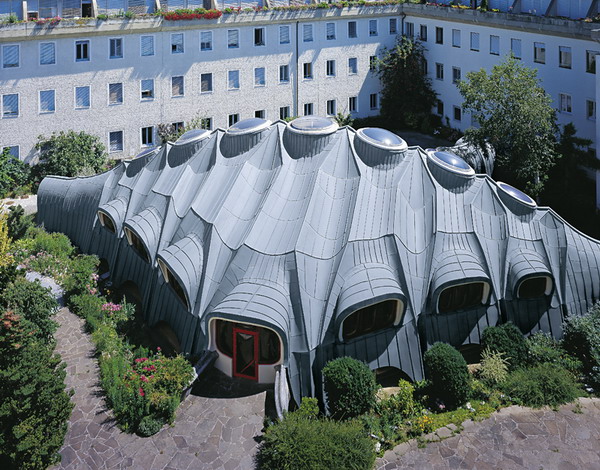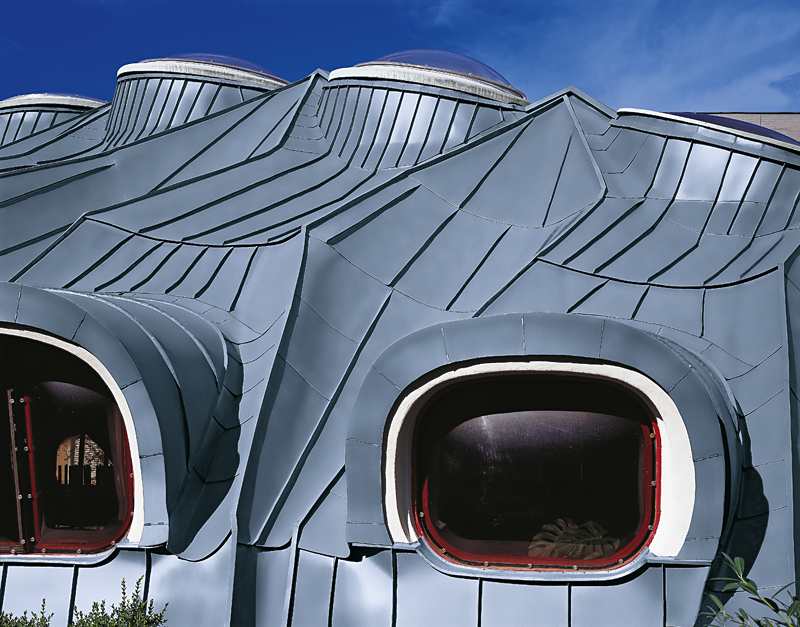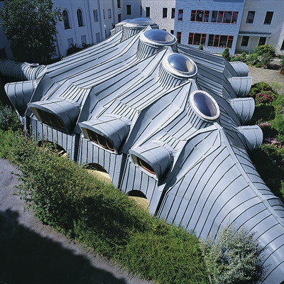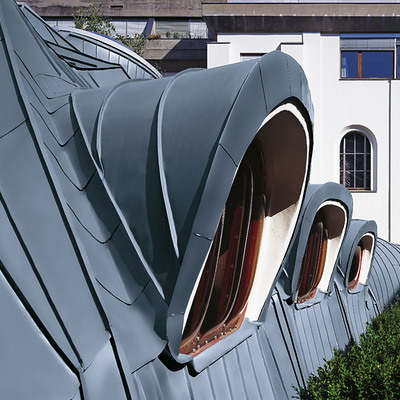 Errichtet wurde dieser in Architekturkreisen weltweit bekannte “Mehrzwecksaal der Grazer Schulschwestern” im Jahr 1977 aus Spritzbeton mit einem Dichtanstrich, der jedoch seine Funktion nicht erfüllen konnte. So erhielt der geniale, an einen biologischen Körper erinnernde Bau von Arch. DI Günther Domenik nach 10 Jahren eine neue Haut aus RHEINZINK. Die Spenglerarbeiten am Mehrzwecksaal der Grazer Schulschwestern, einem Dach mit völlig freier Formgebung ohne gerade Linien, haben 2 Jahre gedauert. Jede einzelne Schare musste in Länge und Breite den jeweiligen Erfordernissen angepasst werden. Die RHEINZINK-Umhüllung funktioniert nun schon seit fast 40 Jahren ohne nennenswerten Pflegeaufwand. Auch die Optik hat sich trotz stetiger Veränderung der Umweltbedingungen nicht wesentlich geändert - eine gleichmäßige Patina schützt und gibt dem Gebäude eine würdige Ausstrahlung. Alles in allem ist es eine Gebäudehülle, die sich seit Jahrzehnten bewährt hat, schön und funktionell ist und an der keine Jahreszahl zu sehen ist.