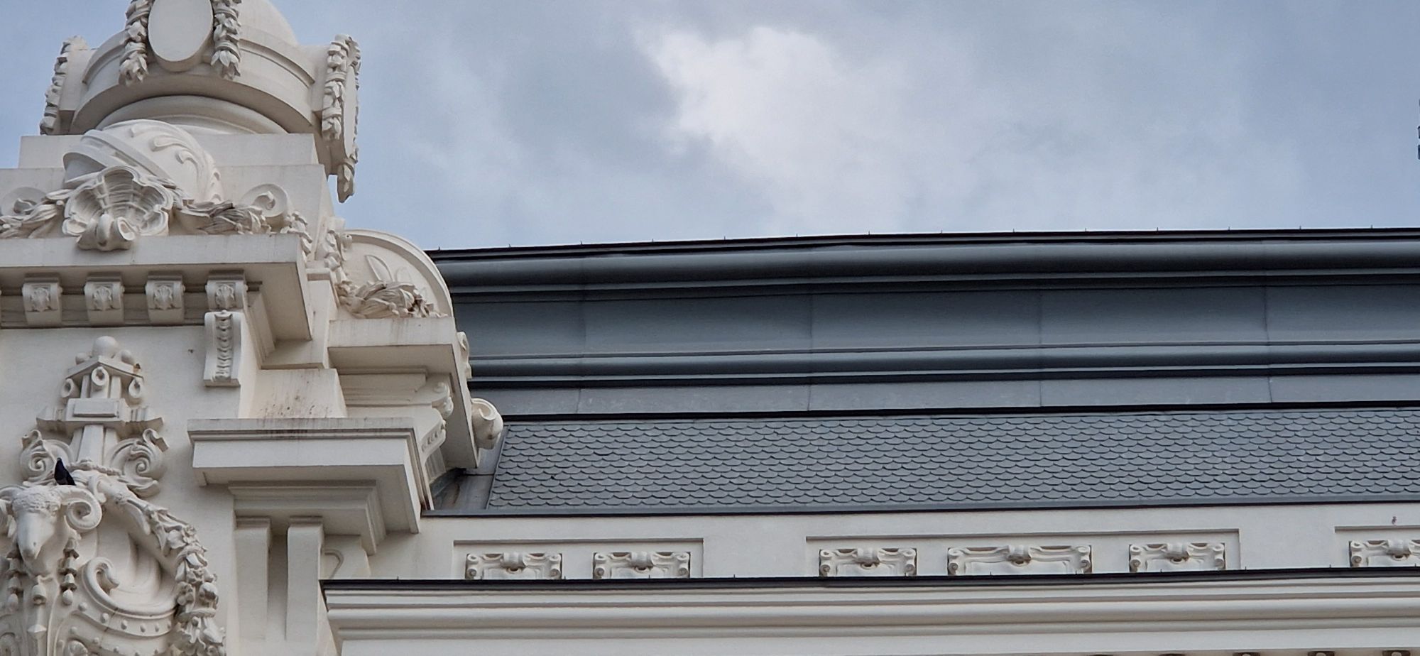 Bei der Restaurierung spielte die Dachsanierung eine zentrale Rolle. Zum Einsatz kam dabei RHEINZINK-prePATINA ECO ZINC blaugrau – insgesamt mehr als 20 Tonnen hochwertiger Titanzink. Die Dacheindeckung erfolgte in traditioneller Doppelstehfalztechnik, die sowohl die historische Anmutung des Gebäudes wahrt als auch höchste Langlebigkeit gewährleistet.